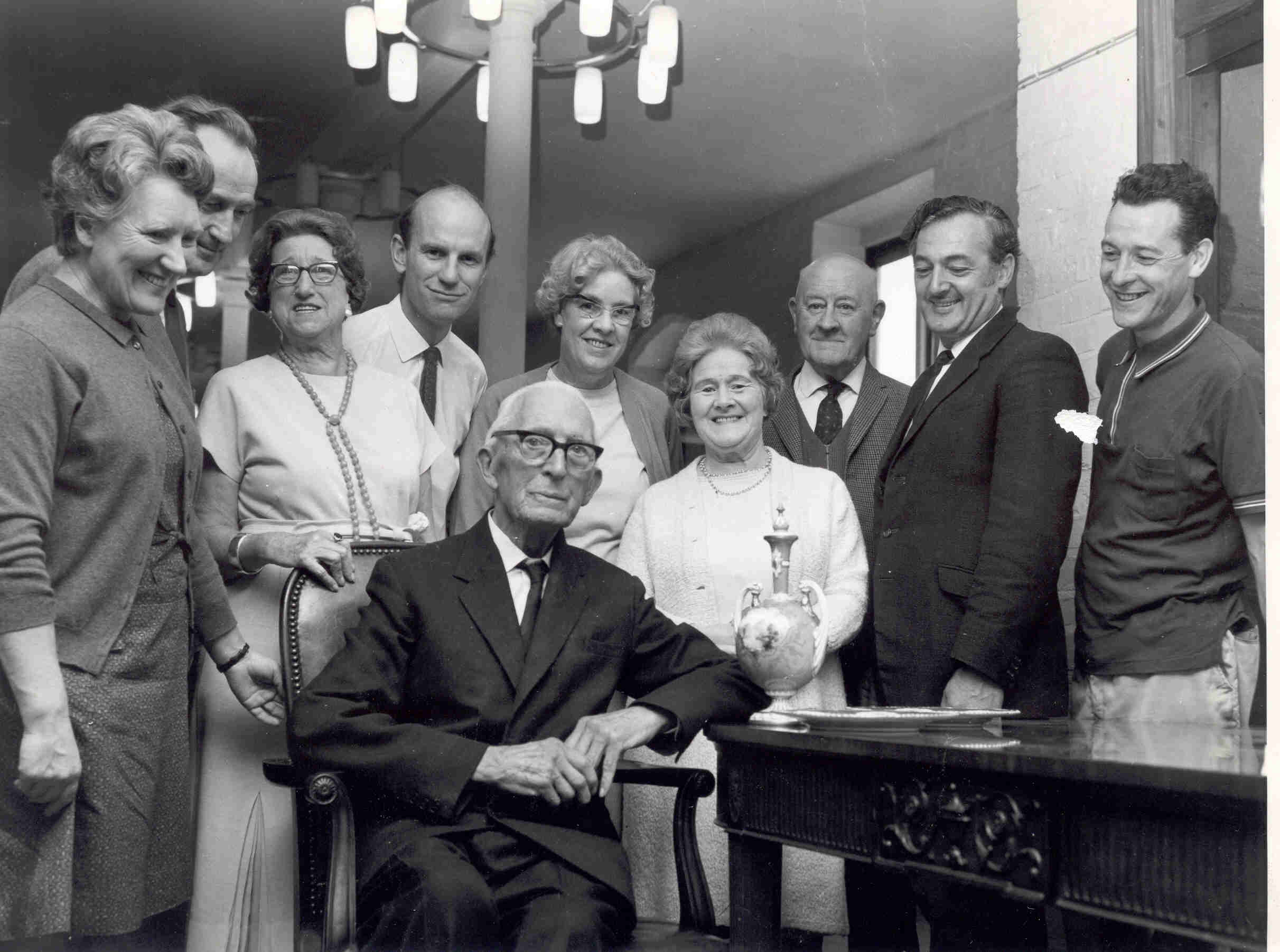 After Harry Davis had been retired for a while I invited him to come to the Museum and meet some of his old colleagues. In the photograph are Professor Baker, Daisy Rea, Neal French, Percy Burgess and Ivor Williams. Some of his porcelain from the museum is on the table. The photograph was published in the local paper.