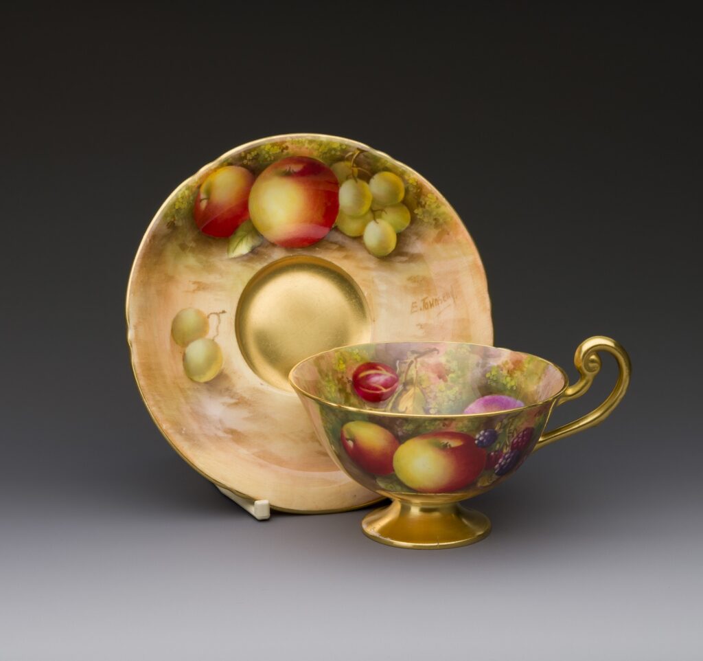 | Description | Tea cup and saucer, hand painted with fruit by Edward Townsend, dating to 1937. |