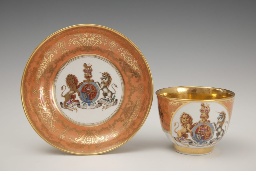 | Description | Wide salmon ground over decorated with gilded cornucopia and swags. White panels with full coat of arms of King George III. Interior of cup and back of saucer solid gold. Ring handle to cup. This exceptionally lavish cup and saucer is from a tea service made for George III by Barr, Flight and Barr around 1807. It is said that the king always drank his tea from the saucer, which is perhaps why he asked for the underside of the saucers in this service to be decorated in solid gold. |