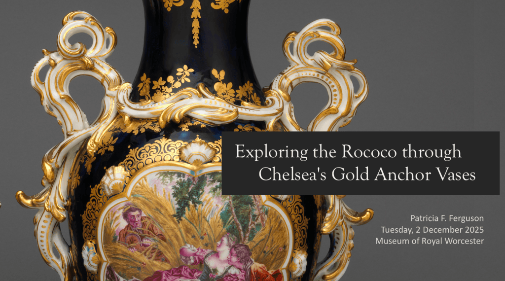 By the 1750s–60s, English porcelain factories like Worcester and Chelsea embraced Rococo, even as taste was shifting toward Classical order. Worcester adapted Rococo silver shapes for tablewares, but Chelsea—under Flemish silversmith Nicholas Sprimont—produced some of the boldest Rococo porcelain in Europe, rivaling Meissen and Sèvres. This talk explores Chelsea’s gold anchor period (c.1758–64), its spectacular vases, its rivals, and its enduring legacy.